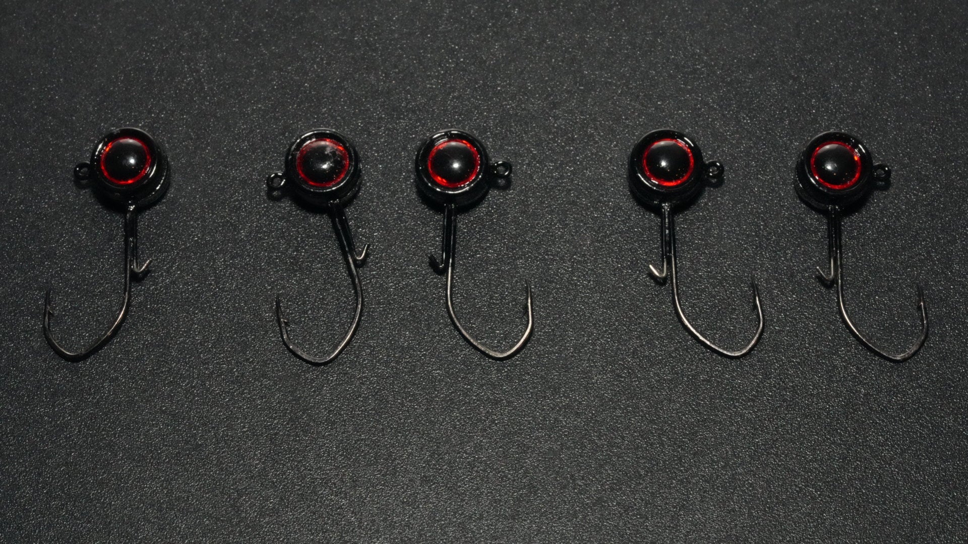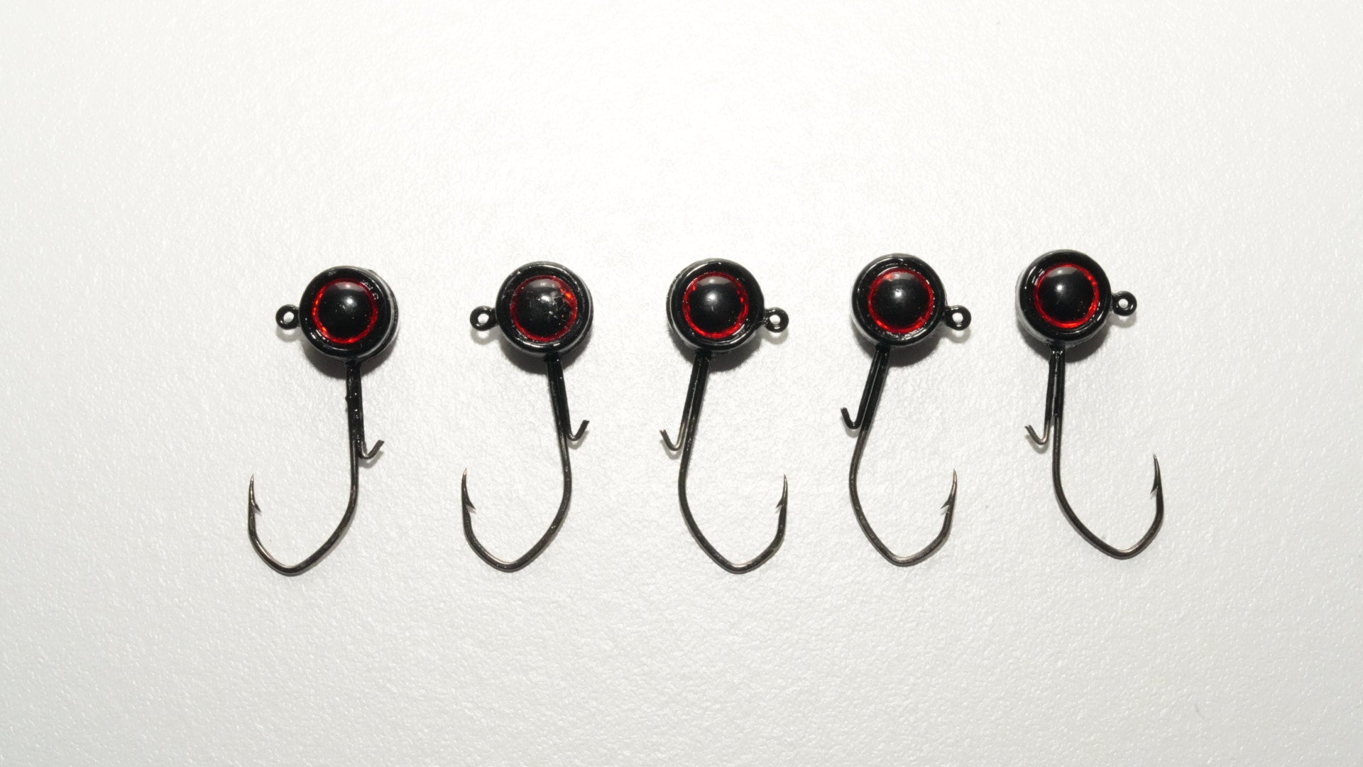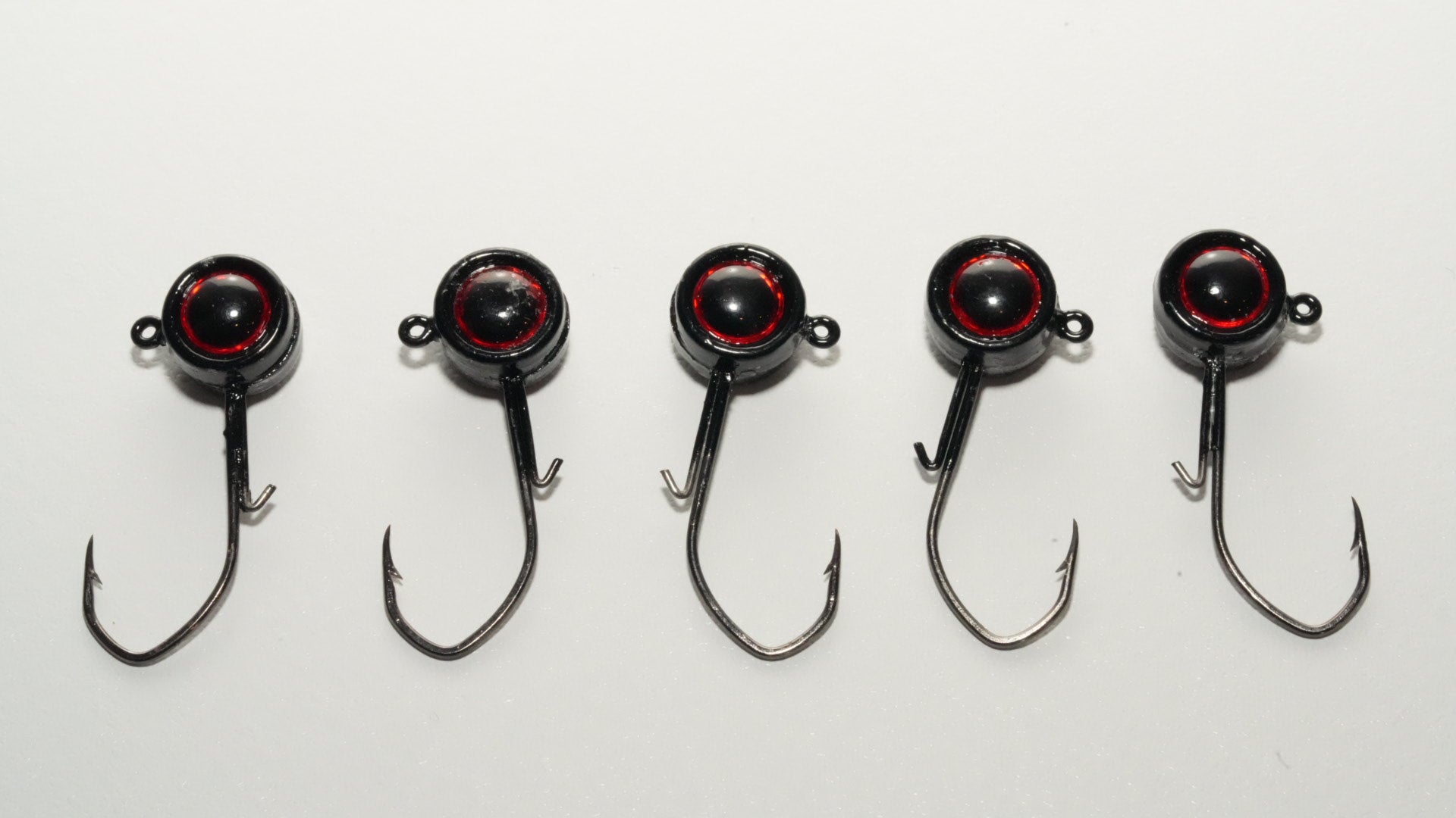5 pack of 1/8oz BLACK jig heads WITH keepers also with RED eyes.